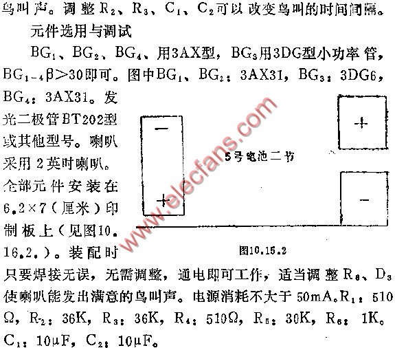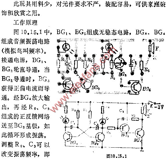 V1,V2構(gòu)成互補自激振蕩器,利用R,C的充放電模擬鳥兒的鳴叫聲。