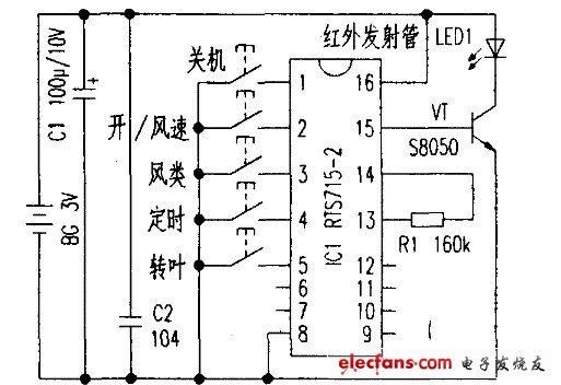 遙控器電路以編碼集成電路IC 1(RTS571-2)及其外圍元件組成,其中IC1①一⑤腳分別是關(guān)機(jī)、開/風(fēng)速、風(fēng)類、定時、轉(zhuǎn)葉鍵輸人端;⑧腳接電源負(fù)端;⑩腳接電源正端;⑥、⑦腳與⑨一⑩腳懸空未用;⑩、⑩腳外接電阻R1,與ICi內(nèi)部電路組成振蕩電路,產(chǎn)生38kHz載波信號,經(jīng)①一⑤腳功能鍵編碼調(diào)制后,由⑩腳輸出編碼載波信號,經(jīng)三極管VT放大,驅(qū)動紅外發(fā)射管LEDI向外界發(fā)射紅外遙控信號,控制風(fēng)扇的工作狀態(tài)。