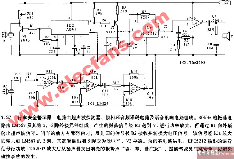 本例電路圖可以通過向司機間斷的發(fā)送嘟嘟聲和閃爍光來起到防睡提醒的作用,而且只在夜間工作,白天會自動關閉提醒功能。