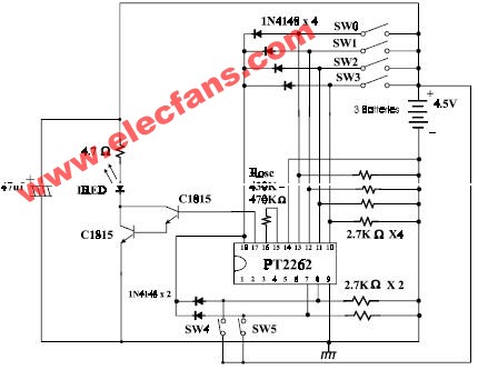 PT2262/2272是一對帶地址、數(shù)據(jù)編碼功能的紅外遙控發(fā)射/接收芯片。其中發(fā)射芯片PT2262-IR將載波振蕩器、編碼器和發(fā)射單元集成于一身,使發(fā)射電路變得非常簡潔。