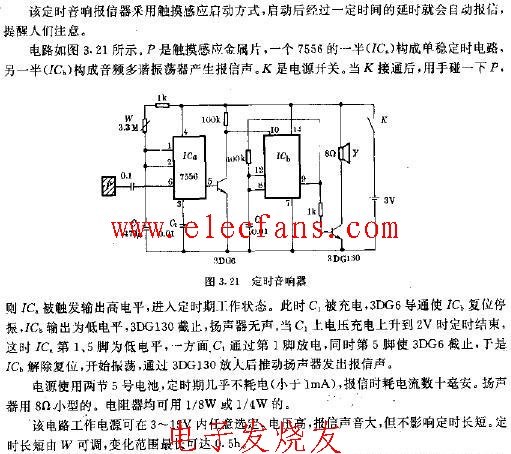 集成電路IC1是一片555定時電路,在這里接成單穩(wěn)態(tài)電路。平時由于觸摸片P端無感應(yīng)電壓,電容C1通過555第7腳放電完畢,第3腳輸出為低電平,