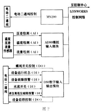 在冷凍水循環(huán)系統(tǒng)中,所有模擬輸入量數(shù)據(jù)都通過SMART CONTROL公司的AD80模擬輸入模塊轉(zhuǎn)換為數(shù)字量,并被傳輸?shù)江h(huán)控中心和控制器。所有數(shù)字輸入輸出量都通過D80數(shù)字輸入輸出模塊送往控制中心或現(xiàn)場執(zhí)行器。另外,系統(tǒng)中需要進行線性調(diào)節(jié)的控制對象(即模擬輸出量),例如旁通調(diào)節(jié)閥采用MN200控制器控制。系統(tǒng)監(jiān)控原理如圖2所示。