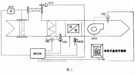 對空調(diào)機組的控制選用符合LonWark互操作總線標(biāo)準(zhǔn)的MN200控制器,裝上MicroNet Tech Tool軟件庫的各種軟件后可控制熱泵、風(fēng)機盤管及通風(fēng)機組。它既可獨立使用,也可聯(lián)網(wǎng)使用。每個控制器提供一個MN-SX數(shù)字傳感器、LED顯示器和可拆卸配線座。該控制器的另一個特點是具有DIN導(dǎo)軌或嵌裝能力。MN200控制器可工作在單獨模式下,也可作為雙絞線自由拓撲結(jié)構(gòu)的MicroNet LonWorks網(wǎng)絡(luò)的一部分。