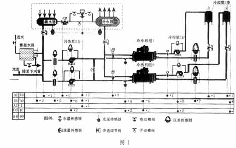 (8)測量總供回水管溫度及集水器和分水器之間的旁通流量,計算系統(tǒng)冷熱負荷,確定啟停冷水機組系統(tǒng)運行機組臺數(shù)及聯(lián)動水泵和冷卻塔的運行臺數(shù),以此將負荷均勻地分配在各臺機組上。使電流需求量的峰值保持在最小。