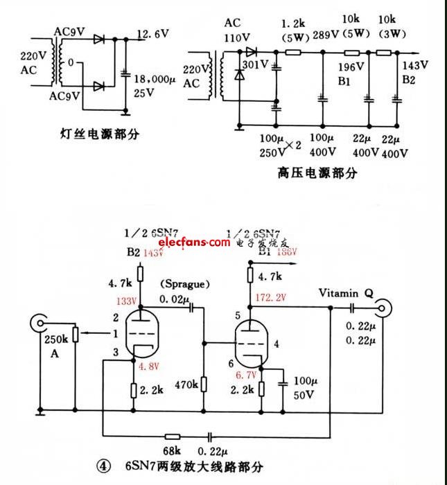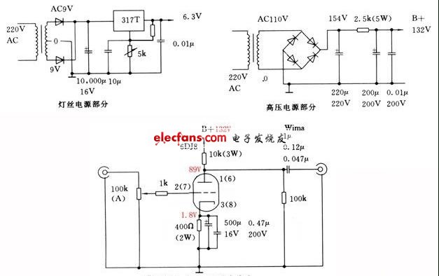 ?? 但12AU7的陰極工作電壓為148V,對燈絲電壓高出百余伏,較手冊陰極對燈絲限制值90V高,當(dāng)然,也能工作,但會減短電子管的壽命,請用分壓電阻把燈絲浮于約90V工作。?