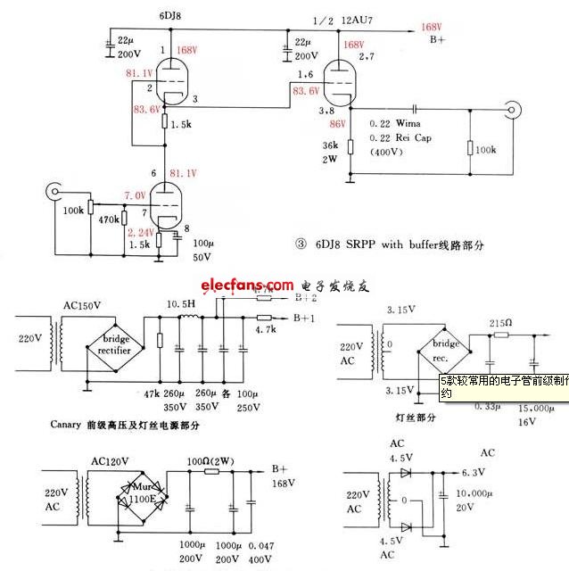 ??? 第三款是6DJ8SRPP加buffer,buffer電子管可用6DJ8、6922、6FQ7、12AU7、12AX7,線路見圖③。它是近期Canary及金牛牌—,款前級的線路,此線路比一級的6DJ8順滑廠也清爽了,控制力好了,聲底也厚了一點(diǎn),過荷量十分充裕。確實(shí)比一級的線路更為優(yōu)越,相信也比單用6DJ8作SRPP不加buffer的線路更佳。但要提的是buffer電子管需用12AU7,因它能調(diào)和6DJ8的晶體管音效特性,也保持爽朗清醇的音色,有點(diǎn)似XLO線的音效。筆者以自己的制品換上RCA? l2AU7? 做buffer與Canary機(jī)buffer換上Amperex金腳6922作比較(原是用6FQ7),始終仍以12AU7作buffer較正。如擁有Canary前級的朋友,只要改—廠中間電子管座燈絲的供電接腳,即4、5腳短接后接正電,9腳接負(fù)電,其他零件不用換,便可換上12AU7電子管。另外,筆者也曾試用了兩對(并接)被稱是人間妙品的整流子C25P40F/FR,此對整流子可作為晶體管后級用,規(guī)格為25A 400V。這次試音用一對Forte lA后級作Bi-amp及Reference3A Baccarat喇叭,用一對后最明顯是低音更為有力,音樂器件分隔度清楚,聲底爽朗了;用兩對后,分隔度則更上一層樓。筆者也曾閱讀過上一級電子管用1/2 6DJ8、下一級電子管1/2 12AU7及另一上下兩級均用12AU7的SRPP線路,不知效果如何?;剡^頭來再說此機(jī),音效有晶體管機(jī)的爽朗明快,也具有點(diǎn)電子管機(jī)的柔順音質(zhì),分析力佳,如聽?wèi)T了Marantz 7的聲音,定有耳目一新的感覺,或許會愛上它。筆者卻較為貪心,認(rèn)為發(fā)燒友最好是魚與熊掌兼得之。