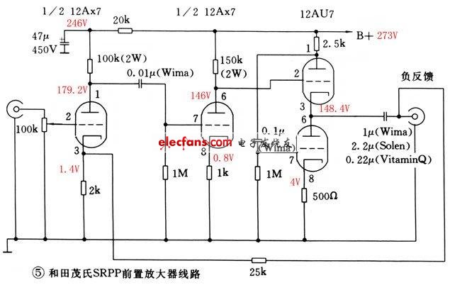 ?? 第四款介紹的為一6SN7兩級放大有負(fù)反饋的線路,見圖④。筆者用了CV 181電子管,此線路也極易制作,中音的厚度及順滑度為眾機(jī)之冠,功率普通,可惜是高及低頻均未算特殊,收斂了一點(diǎn),不知是否因中頻太好反而令高低頻顯得失色,有點(diǎn)像舊日I另3/5A。不過,即使音效不全面,但也極討人歡心,特別是播放提琴及女聲。不知加了一級buffer后,能否改善高低頻,讓此機(jī)表現(xiàn)更全面,筆者定會一試,如有好結(jié)果,定向各位報(bào)告。無論如何,筆者會選它而舍6SN7SRPP,因它起碼有一極強(qiáng)的項(xiàng)目。