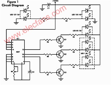 The Circuit Diagram is shown in Figure 1. It consists of a 4047 low-power monostable/astable multivibrator, IC1, used in the astable mode to provide the timing pulses to control the flash rate of the LEDs. To accomplish the astable mode, pins 4, 5, 6, and 14 are connected to +12VDC and pins 7, 8, 9, and 12 are connected to ground. Pins 1 and 3 are connected to C2 and pins 2 and 3 are connected to potentiometer R9. A fixed value resistor can be used in place of the potentiometer R9, if the flash rate does not need to be adjusted. These three pins make up the R-C timing circuit. The output pulses from the 4047 are taken from pins 10, 11, and 13. Pin 10 is the Q output and pin 11 is the Q-not output. These two pins are onnected to R6 and R7 respectively.