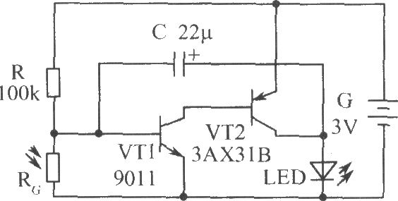 工作原理:三極管VT1與VT2組成互補型自激多諧振蕩怨,振蕩反饋網(wǎng)絡(luò)由電容C組成。VT1的基極偏置電路由電阻R與光敏電阻器RG共同構(gòu)成。白天室內(nèi)光線較強,RG受強光照射而呈低電阻,VT1基極處于低電平,VT1與VT2均處于截止狀態(tài),發(fā)光二極管LED不發(fā)光。晚上,室內(nèi)光線較弱,光敏電阻器RG阻值升高,VT1基極電位上升,當升至0.65V左右時,振蕩器開始工作,VT2間隔導(dǎo)通與截止,LED就會按振蕩頻率閃爍發(fā)光。VT1可用9011等硅NPN三極管,要求β≥100;VT2采用3AX31B等鍺PNP三極管,β值大于30即可。LED視各人喜愛,可采用紅色或綠色圓形發(fā)光二極管。