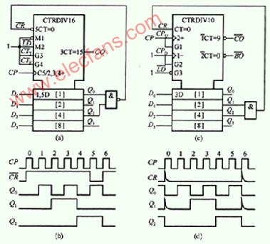下圖所示依次是利用74163和74192構(gòu)成的模6計數(shù)器,工作波形圖如圖。