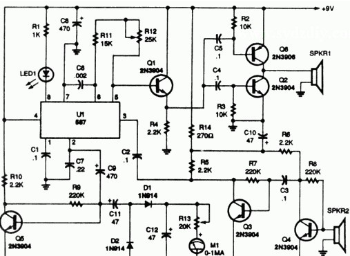 圖中SPKR1和SPKR2均為壓電高音喇叭,用來發(fā)送和接收超聲波。電路核心為567鎖相環(huán)集成電路,完成發(fā)送和接收的雙重功能。第⑤腳為方波輸出,其頻率由R12調(diào)整,送至Q1后,由其發(fā)射極耦合至由Q2和Q6組成的功放部分,最后推動SPKR1向外送出超聲波。接收超聲波由另一只喇叭SPKR2完成,經(jīng)Q3和Q4的兩級高增益放大后送至第③腳,只要接收信號頻率在567的帶寬之內(nèi),LEDl便可發(fā)光。