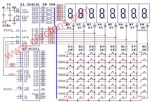 用CH452動(dòng)態(tài)驅(qū)動(dòng)8個(gè)共陰數(shù)碼管電路