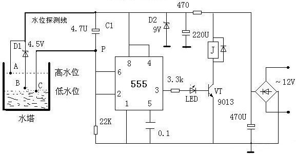 如圖,圖中繼電器J是用來控制水泵的電源,電容C1是為了消除信號線上的干擾。? IC:NE555接成施密特觸發(fā)電路,利用其回差特性而達(dá)到保持的目的。