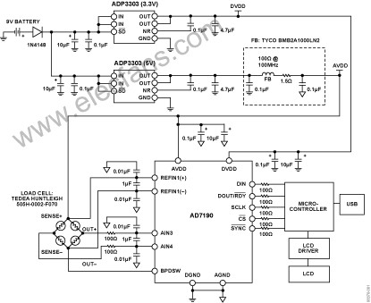 該電路是一個(gè)電子秤系統(tǒng),它使用AD7190,超低噪聲,與內(nèi)部PGA的24位Σ-Δ型ADC。在AD7190簡(jiǎn)化了電子秤的設(shè)計(jì),因?yàn)樵撓到y(tǒng)的大部分組成部分,包括在芯片上。