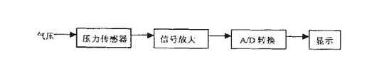 下面以測量輪胎氣壓為例詳細闡述氣壓傳感器在汽車輪胎方面的應用。此種設計可做成一種便攜式的裝置,測量時將氣壓傳感器的表置于輪胎氣門嘴上,這時胎壓作用于傳感器的膜片上, 通過壓阻效應和系列變換輸出微弱的電壓信號,將電壓信號進行相應處理顯示電壓值。由此可知不同的氣壓對應著不同的電壓值,即氣壓值和電壓值是一一對應的,從而間接測量了氣壓值。胎壓測量電路方框圖如圖2所示。