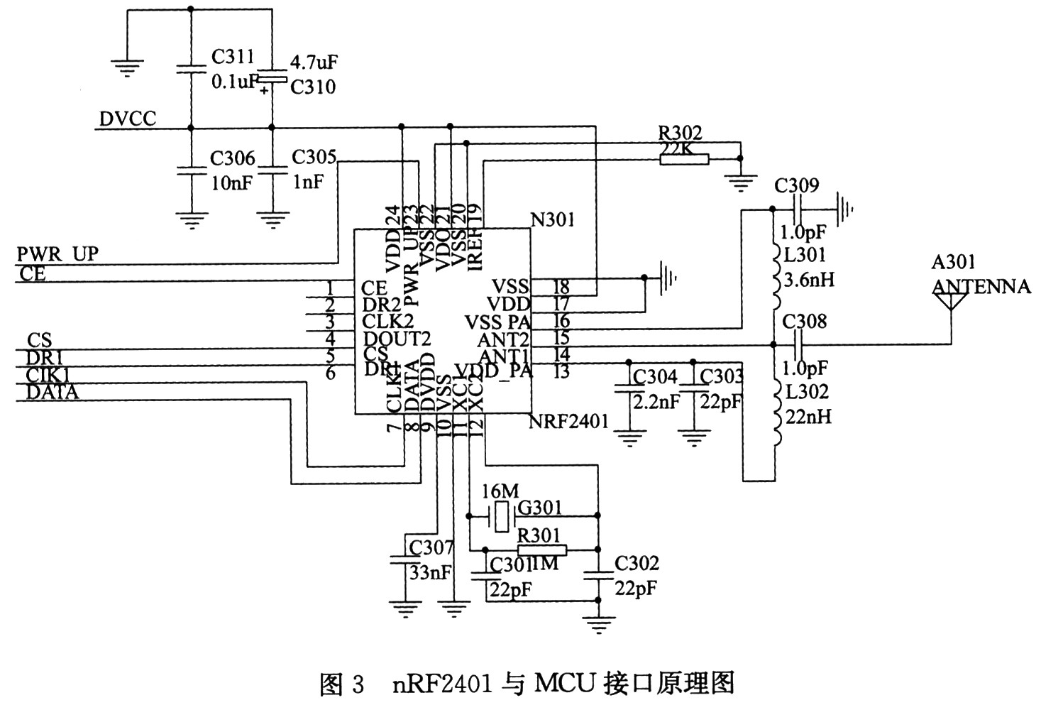 2158 nRF2401 是單片射頻收發(fā)芯片,工作于2.4~2.5GHz ISM 頻段,芯片內(nèi)置頻率合成器、功率放大器、晶體振蕩器和調(diào)制器等功能模塊,輸出功率和通信頻道可通過程序進(jìn)行配置。芯片能耗