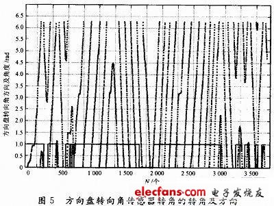 使用定時器3的兩個引腳(T3IN、T3EUD)作為正交脈沖的輸入,在正確設(shè)置相關(guān)寄存器后,定時器3的數(shù)據(jù)寄存器的值與方向盤轉(zhuǎn)角成正比,故可方便的計算轉(zhuǎn)角,本文所使用的方向盤轉(zhuǎn)角傳感器每一圈對應(yīng)44個