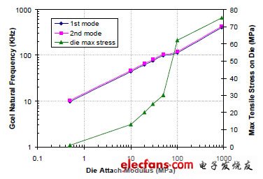 因此進行了一項研究,確定理想的固晶材料的屬性的范圍,以及對封裝共振頻率和芯片應(yīng)力的影響。圖5給出了根據(jù)固晶模量計算的感應(yīng)單元的固有頻率,以及感應(yīng)單元基片承受的相應(yīng)的最大張應(yīng)力。