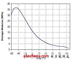 經(jīng)過一些研究后,我們發(fā)現(xiàn)固晶材料E滿足我們的性能要求。為了確保采用新固晶膠的芯片的共振性能足夠滿足要求,我們對材料模量隨溫度的變化進行了測量。同時進行了動態(tài)力學(xué)分析(DMA)。對測試樣本進行了處理,將材料放到一個扁平的預(yù)成型的腔中并進行固化處理。然后測試樣本隨溫度的變化。圖6顯示了材料的模量。