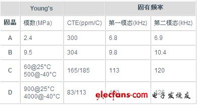 在上圖中,固晶膠D的測試結(jié)果是最理想的,沒有出現(xiàn)任何失真,而固晶膠A由于失真產(chǎn)生了-0.2 kph的誤差。根據(jù)球跌落測試,感應(yīng)單元限幅點的頻率大約為20 kHz。任何大于這個值的封裝頻率將不會引起共振問題。對使用不同固晶膠的封裝進行了基于有限元的模型分析。由于在平面運動中,只有這兩個移動與感應(yīng)單元的X和Y軸有關(guān),因此只給出了固有頻率的第一和第二模態(tài)。表1列出了各種固晶材料的屬性,并針對給定固晶膠和產(chǎn)生的封裝共振頻率進行了分析。這些材料分屬兩種極端類別。硬固晶膠如固晶膠D滿足封裝共振條件,但是會引起芯片裂紋。軟固晶膠如固晶膠A不會引起芯片裂紋,但是封裝不符合共振要求。