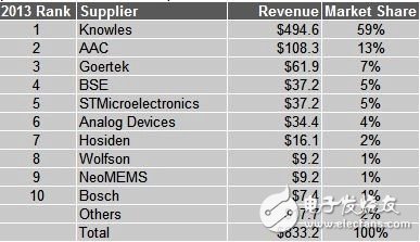 2013年的7.85億美元增長(zhǎng)到2019年的16.5億美元;出貨量將從2013年的24億顆增長(zhǎng)到2019年的66億顆。因此,對(duì)新進(jìn)廠商而言,MEMS麥克風(fēng)市場(chǎng)充滿(mǎn)機(jī)遇。樓氏電子(Knowles)是全球