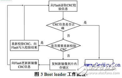 碼的地址,開始執(zhí)行如圖3所示的工作流程。由于內(nèi)部鏡像的CRC信息被清空,所以被判斷為不正確而執(zhí)行下一步。由于為0的CRC信息標(biāo)志著不需要被重新校驗,故執(zhí)行將新鏡像復(fù)制到片內(nèi)Flash的操作,并產(chǎn)生新鏡像的CRC信息。然后,重新執(zhí)行啟動代碼。新鏡像啟動時讀取其CRC信息,再次判斷后跳轉(zhuǎn)到應(yīng)用程序區(qū),完成整個啟動過程。