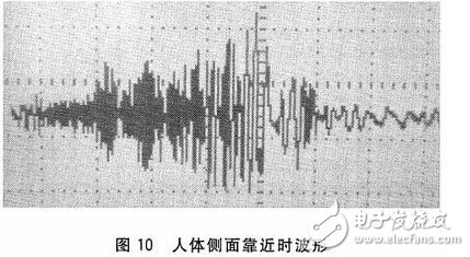 當(dāng)人體從多普勒微波傳感器側(cè)面移動至傳感器前面時,微波檢測裝置檢測到的波形如圖10所示??梢钥闯?,整條曲線(電平)與圖8的曲線是十分相似的,也是呈上升趨勢。