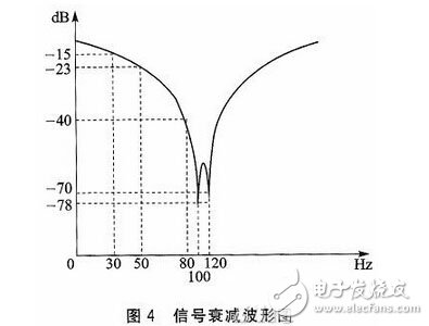 經(jīng)過試驗,該陷波器對各頻率的衰減情況如圖4所示。陷波器對100 Hz或120 Hz頻率的衰減在70 dB(3 162倍)以上,而在80 Hz頻率的衰減只有40 dB(100倍)。對于人體運動的頻率50 Hz(對應(yīng)運動速度0.7 m/s)的衰減更是直線下降,只有不到23 dB(14倍),可以忽略不計。因此該陷波器能有效地濾除干擾信號。