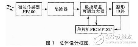 本設(shè)計在硬件上主要包含微波傳感器HB100、陷波器、數(shù)控增益可調(diào)放大器、整形電路和單片機(jī)PIC16F1824等部分,設(shè)計框圖如圖1所示。