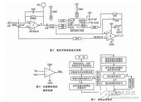 該多普勒信號先經(jīng)過陷波器濾除信號中的噪聲,然后再進(jìn)入數(shù)控增益可調(diào)放大器,信號被放大后被單片機(jī)識別;放大后的信號一路直接送入單片機(jī),另一路經(jīng)過整形電路后將不規(guī)則的信號整形后再送入單片機(jī),借此來衡量多普勒信號的頻率。