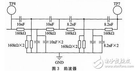智能馬桶中需檢測人體的靠近和離開,經(jīng)過分析相關(guān)數(shù)據(jù)和試驗數(shù)據(jù),發(fā)現(xiàn)人體的運行頻率集中在30~80Hz,容易受到環(huán)境和電網(wǎng)中100 Hz或120 Hz的輻射干擾,造成誤觸發(fā)動作,因此設(shè)計中增加了陷波器實現(xiàn)濾除功能,如圖3所示。