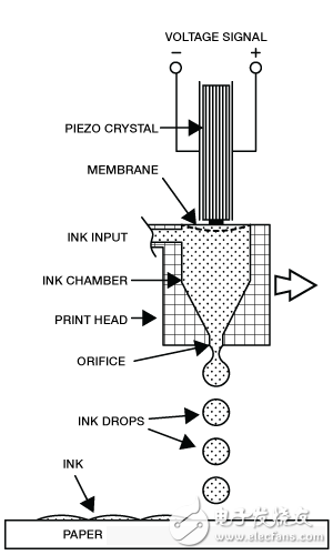 許多商用和工業(yè)用噴墨打印機(jī)使用基于MEMS技術(shù)的打印機(jī)噴頭,保持這些墨滴并在需要時精確地放下這些墨滴——這一技術(shù)被稱為按需投放(DoD)。墨滴放置在橫跨壓電材料(比如 lead zirconatetitanate,)組成的元件中,通過施加的電壓來進(jìn)行擠壓。這增加了打印頭墨水室的壓力,通過施力形成一個非常小量(相對壓縮)的墨水,并從噴嘴中噴出。