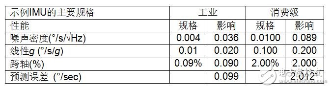 近年來,噪聲在區(qū)分傳感器級(jí)別上所起的作用有所降低。在超出簡(jiǎn)單判定或相對(duì)靜止運(yùn)動(dòng)確定的應(yīng)用中,線性g效應(yīng)和對(duì)準(zhǔn)誤差之類的參數(shù)成為噪聲源,通過芯片設(shè)計(jì)方法或器件專用校準(zhǔn)來改善它們需要付出高昂的成本。表6中的使用案例比較了實(shí)際工業(yè)MEMS IMU和消費(fèi)級(jí)IMU,二者均有比較好的噪聲性能。然而,消費(fèi)級(jí)器件并未針對(duì)振動(dòng)或?qū)?zhǔn)進(jìn)行設(shè)計(jì)或校正?;诮o出的假設(shè),本例顯示了器件規(guī)格及其對(duì)誤差預(yù)算的影響。總誤差為所示三個(gè)誤差源的和方根,消費(fèi)級(jí)器件的誤差以線性g和跨軸(對(duì)準(zhǔn)誤差)為主,工業(yè)器件則實(shí)現(xiàn)了更好的平衡。最終,不考慮耐用性較差消費(fèi)級(jí)產(chǎn)品的其他潛在誤差源的話,二者性能相差至少20倍。
