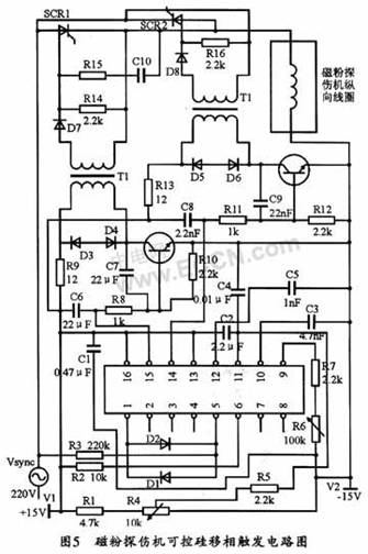 11002 電路控制系統(tǒng)中的可控硅調(diào)壓方案進行改進。目前,在生產(chǎn)中使用的磁粉探傷設(shè)備中,周向電流多采用2只可控硅反向并聯(lián)組成調(diào)壓電路。而本文則給出了采用TCA785移相觸發(fā)器對可控硅實現(xiàn)調(diào)壓的方法。
