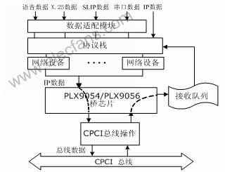 ????異構(gòu)網(wǎng)絡(luò)通過(guò)標(biāo)準(zhǔn)信道適配接入分布式系統(tǒng),語(yǔ)音、X.25、串口數(shù)據(jù)等非IP數(shù)據(jù)經(jīng)由數(shù)據(jù)適配模塊轉(zhuǎn)換成IP數(shù)據(jù),系統(tǒng)中各板卡的嵌入式實(shí)時(shí)系統(tǒng)對(duì)數(shù)據(jù)進(jìn)行處理和交互。各種異構(gòu)網(wǎng)絡(luò)掛接在嵌入式系統(tǒng)中相應(yīng)網(wǎng)絡(luò)設(shè)備上,網(wǎng)絡(luò)設(shè)備驅(qū)動(dòng)調(diào)用CPCI總線驅(qū)動(dòng)提供的統(tǒng)一接口實(shí)現(xiàn)實(shí)時(shí)系統(tǒng)與總線之間的數(shù)據(jù)傳輸。發(fā)送數(shù)據(jù)時(shí),網(wǎng)絡(luò)設(shè)備驅(qū)動(dòng)通過(guò)總線驅(qū)動(dòng)控制橋芯片進(jìn)行地址轉(zhuǎn)換、數(shù)據(jù)轉(zhuǎn)發(fā)、中斷產(chǎn)生等工作,生成相應(yīng)的總線操作將數(shù)據(jù)送往總線;接收數(shù)據(jù)時(shí),總線驅(qū)動(dòng)響應(yīng)中斷,接收總線上相應(yīng)地址段的數(shù)據(jù),在中斷服務(wù)程序中進(jìn)行數(shù)據(jù)解析、地址轉(zhuǎn)換、數(shù)據(jù)轉(zhuǎn)發(fā)、其他中斷產(chǎn)生等操作。我們采用Linux操作系統(tǒng),其網(wǎng)絡(luò)系統(tǒng)主要是基于UNIX的socket機(jī)制,系統(tǒng)協(xié)議棧和驅(qū)動(dòng)程序之間通過(guò)專門(mén)的數(shù)據(jù)結(jié)構(gòu)(sk_buff)傳遞數(shù)據(jù)。實(shí)時(shí)系統(tǒng)內(nèi)核與CPCI總線間數(shù)據(jù)傳輸流程如圖2所示: