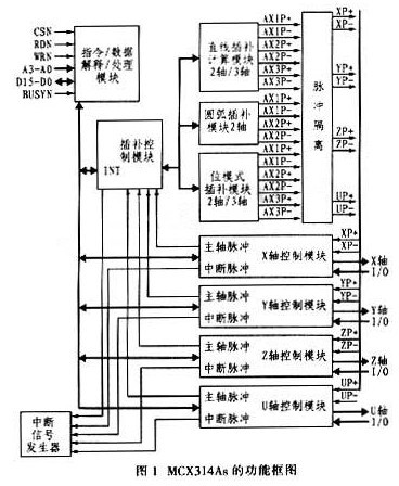 圖1為MCX314As的功能框圖。由相同功能的X、Y、Z和U軸的控制部分和插補(bǔ)計(jì)數(shù)部分組成,主要功能如下: