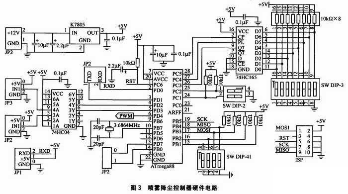 噴霧降塵控制器硬件電路圖如圖3所示??刂破鬟x用AVR系列高性能、低功耗的8位AVR微控制器ATmega88。它具有先進(jìn)的RISC結(jié)構(gòu)和8 KB系統(tǒng)內(nèi)可編程的Flash,數(shù)據(jù)吞吐率高達(dá)1 MIPS/MHz,可以緩解系統(tǒng)功耗和處理速度之間的矛盾;工作溫度范圍比較寬(-40~85℃,完全滿足井下環(huán)境要求;控制器電路具有地址設(shè)定和噴霧模式設(shè)定模塊。