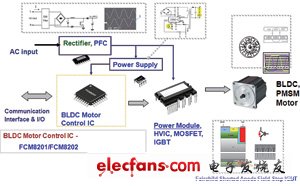 在飛兆半導(dǎo)體產(chǎn)品中,有一系列無刷電機(jī)應(yīng)用參考電路。其中,控制單元(Motor Control IC)-FCM8201/02具備著方波/弦波兩種驅(qū)動(dòng)方式,可依不同產(chǎn)品用途擇一使用及多種保護(hù)功能,有別于一般MCU單元需要軟件撰寫的能力方能設(shè)計(jì)使用,降低開發(fā)技術(shù)門檻,并可大幅的縮短廠商產(chǎn)品開發(fā)量產(chǎn)時(shí)程。其他的如飛兆半導(dǎo)體智能功率模塊 (SPM) (IGBT/MOSFET,HVIC)、PFC、電源管理IC等,飛兆半導(dǎo)體皆可快速提供完整的方案。