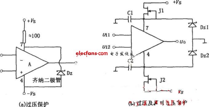 圖(a)為簡單實用的過壓保護電路,它利用穩(wěn)壓二極管Dz將集成運放的電源電壓限制在安全電壓范圍內(nèi),穩(wěn)壓管的工作電壓的選擇方法可依據(jù)下式:Vz≤2Vsmax。通常Vz應(yīng)盡量接近或等于電源的總電壓值,其限流電阻R應(yīng)選用大功率電阻,且阻值應(yīng)能保證穩(wěn)壓管正常工作。
