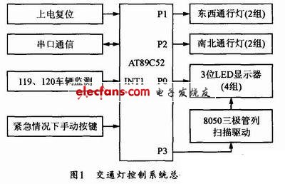 本電路系統(tǒng)采用的控制器是單片機(jī)AT89C52。P0口通過74HC244驅(qū)動,控制數(shù)碼管顯示(通行方向和倒計(jì)時(shí)的時(shí)間);P1口控制東西方向直行、左拐、右拐和行人的紅綠燈的亮滅;P2口南北方向直行、左拐、右拐和行人的亮滅;P3.3用于當(dāng)特殊車輛經(jīng)過時(shí)紅外的接收,從而控制所有車輛和行人禁行,方便特殊車輛的經(jīng)過;P3.7用于當(dāng)緊急情況出現(xiàn)時(shí),交警按下緊急處理鍵,所有行人通行,車輛禁止;增加手動復(fù)位電路和自激震蕩器起振等功能。硬件電路系統(tǒng)總體框圖如圖1。