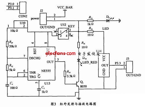 十字路口交通燈在特種車輛到來時(shí)能自動關(guān)閉所有綠燈,讓特種車輛通行。設(shè)計(jì)中采用紅外線發(fā)生器作為特種車的發(fā)射器,使用實(shí)時(shí)中斷來響應(yīng)特種車的通行要求。紅外接收器采用一體化紅外接收器,具有很高的靈敏度和較強(qiáng)的抗干擾能力。當(dāng)按下KEY鍵時(shí),觸發(fā)8050三極管導(dǎo)通,紅外發(fā)射電路接通,紅外發(fā)射管發(fā)射950nm的紅外光,當(dāng)紅外接收管接收信號,輸出低電平,也就是P3.3端口為低電平,系統(tǒng)進(jìn)入紅外中斷功能程序。圖3為紅外發(fā)射與接收電路。