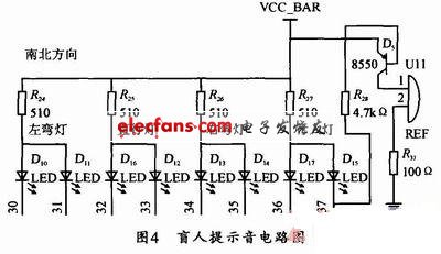 為了方便盲人過人行道,可使盲人提示音電路與人行道通行控制燈綠燈相同步。盲人提示音采用蜂鳴器。由于蜂鳴器工作需要較大的電流,增加一個(gè)三極管功率放大器8550,以提供蜂鳴器足夠大的電流。其盲人提示音電路如圖4所示。