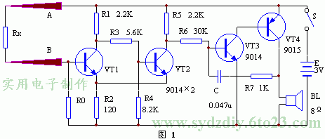 本測(cè)定儀電路原理圖見(jiàn)圖,整個(gè)電路分為兩大部分:晶體管VT1、VT2組成檢測(cè)電路;VT3、VT4組成告警發(fā)生器。