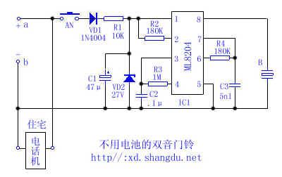 隨著電話機(jī)的普及率越來越高,擁有住宅電話的家庭也越來越多,但大多數(shù)住宅電話使用率很低,利用電話入戶饋線提供的48V(60V)直流饋電作電子門鈴的工作能源是經(jīng)濟(jì)實(shí)用的?,F(xiàn)介紹一款不用電池的雙音門鈴電路。電路原理如圖所示,不難看出,圖中電路是常規(guī)的電話機(jī)振鈴電路的變型。a、b分別是電話機(jī)入戶線的正、負(fù)兩端。AN為常開型門鈴按鈕,在電話機(jī)候機(jī)時(shí),按下AN,程控交換機(jī)提供的48V(或60V)電壓,直流饋電經(jīng)VD1、R1對電容C1充電,當(dāng)C1端電壓Vc達(dá)到IC1的起控電壓時(shí),IC1起振送出雙音電子鈴流使蜂鳴器B發(fā)聲,告知主人有客來訪。而當(dāng)電話機(jī)正在使用時(shí),則圖中a、b之間的電壓較低達(dá)不到IC1的起控電壓,此時(shí),即使按下AN門鈴按鈕也不工作,這是因?yàn)橛捎赗1取值較大,遠(yuǎn)大于電話機(jī)的阻抗。故AN按下時(shí)對電話機(jī)的正常通話無影響。也對程控交換機(jī)無不良影響,僅在使用門鈴時(shí)對其間打入的電話遇忙。