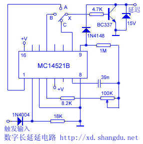 若X與點(diǎn)A相接,延時(shí)為1分40秒至18分30秒,而X與B相接,延時(shí)為13分20秒至2小時(shí)28分。X接至C點(diǎn)時(shí),延時(shí)為1小時(shí)47分至20小時(shí)。具體延時(shí)時(shí)間由100KΩ電位器調(diào)定。若需更長的延時(shí),則可用大電容代替39nF電容。這時(shí),延時(shí)可達(dá)一周以上。在觸發(fā)輸出端加正信號(hào),則4521B內(nèi)的分頻器復(fù)位。