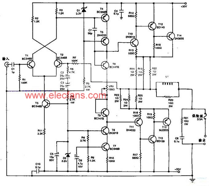 這是基于功率晶體管TIP33C和TIP34C為主要部分構(gòu)建的40W功率放大器的電路圖。它采用對稱/雙電源供電。必須使用散熱器來防止晶體管過熱。