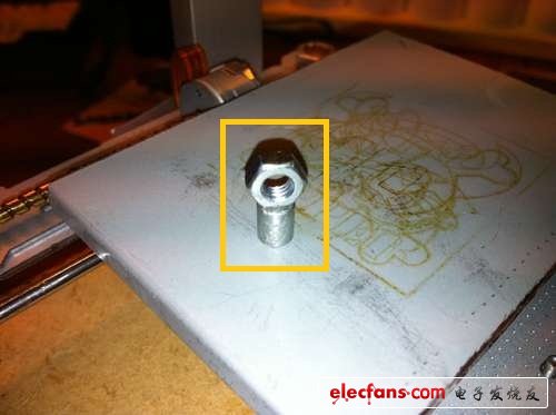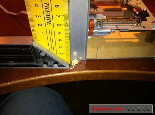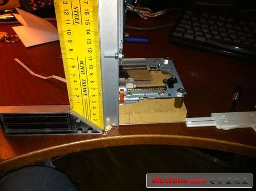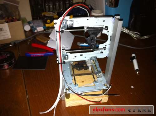 ● 工作空間位于老的激光二極管組件上。確保它表明平整且水平放置,然后在上面涂上些膠水固定好,工作空間就完成了。我發(fā)現一塊 1/4 英寸的壓克力板剛好合適。它能讓工作空間保持足夠的穩(wěn)定性,不過由于激光能夠射穿它,所以我不確定這是否存在安全隱患。后來我想出了一個在我看來效果最棒的解決方案。我切下了一片與壓克力板的大小相同的DVDR 驅動器的金屬外殼,然后用膠水把它粘了上去。這樣工作空間依然非常穩(wěn)定,而且強度也足夠了。它還有一個有利的作用,那就是你可以用磁鐵把你想要雕刻的東西固定在工作空間上。