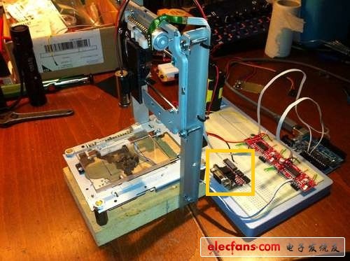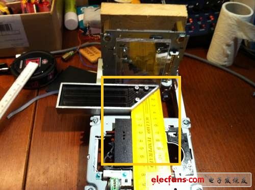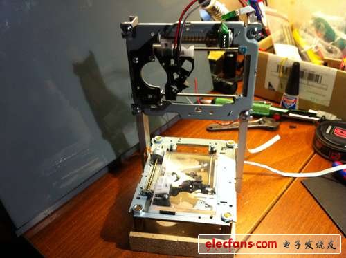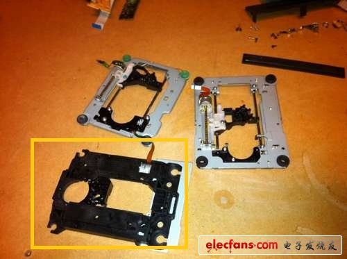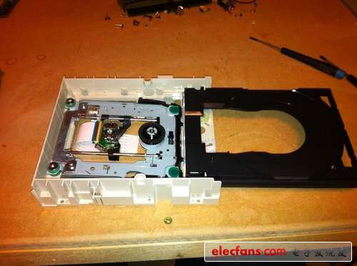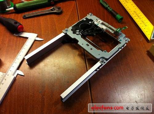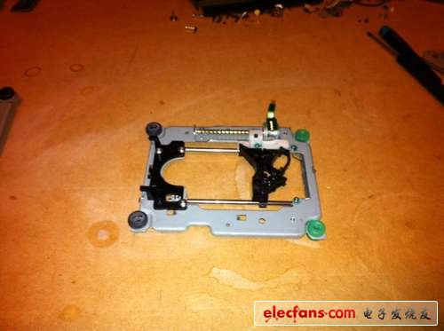 ● 在 DVD-Rom 驅動器中你所需要的只有步進電動機組件和激光二極管。我的運氣不太好,發(fā)現我的 DVD-Rom 帶有一塊非常難處理的塑料組件。于是我拆開了三臺 DVD-Rom 驅動器,卻只用了兩臺里的零件。拆解的過程相當有難度,而且我打開過的大部分 DVD-Rom 驅動器差不多都是這樣的。