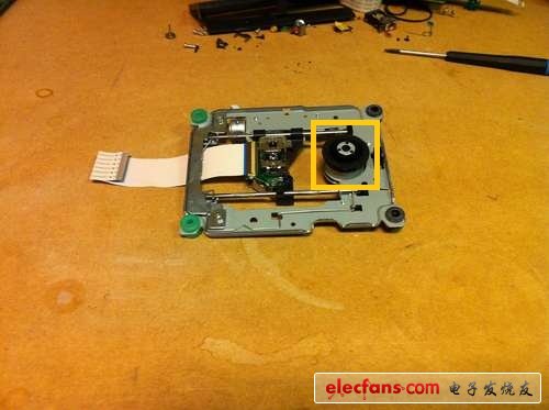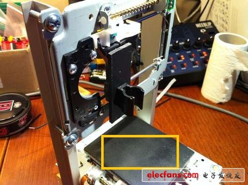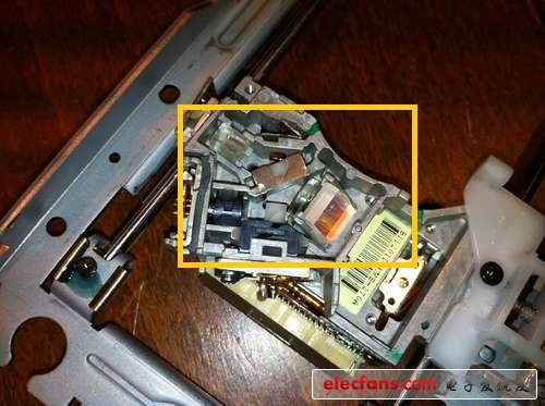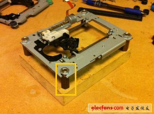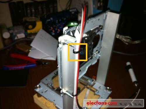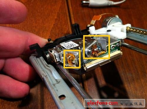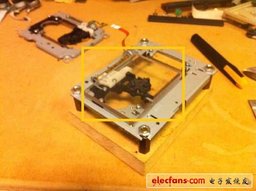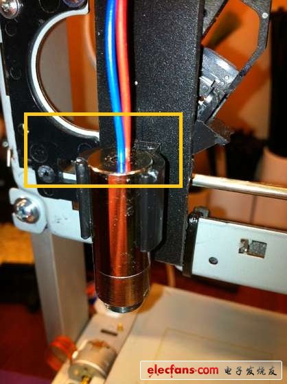 ● 鏡頭嘛,只要用最合適的方法把它拆下來就行了,我們需要留下一個光滑的表面,之后在上面連接一些其他的零件。小心不要弄壞了 DVDR 驅動器的激光二極管。如果你不想要之后再購買一支新的強力激光發(fā)射器的話,就要善待這玩意兒。