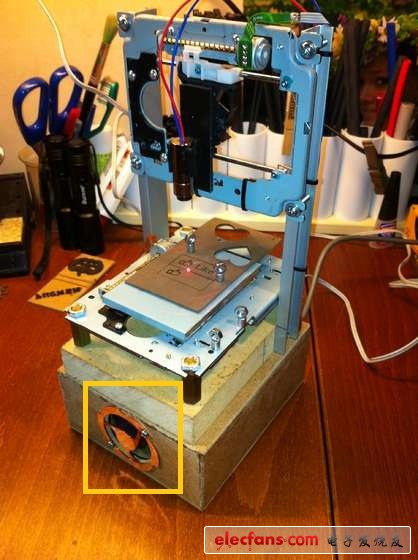把風扇連接在激光發(fā)射器的繼電器上,面朝工作空間以外。它能夠把煙霧吸走,同時不會影響工作空間中的器件